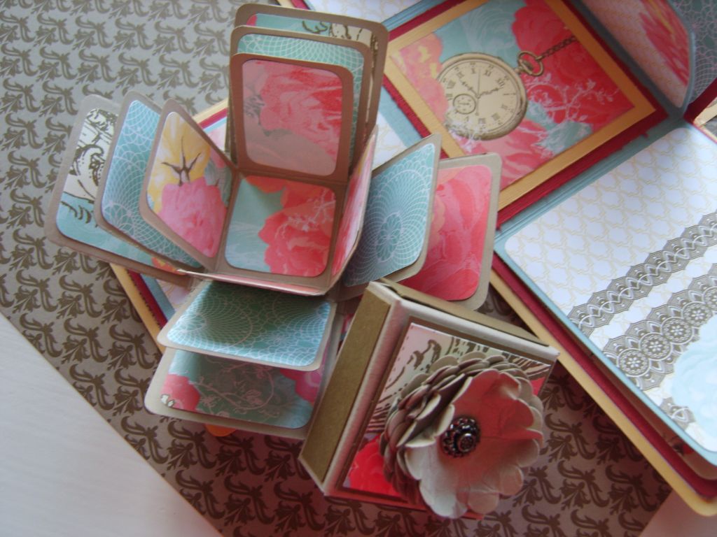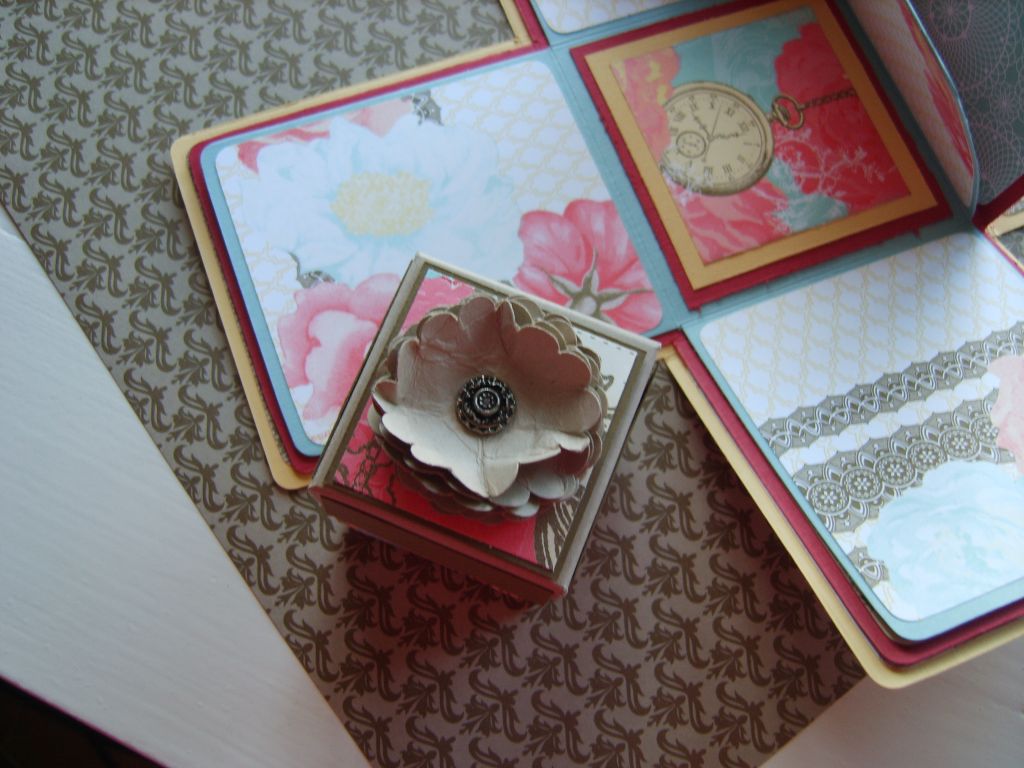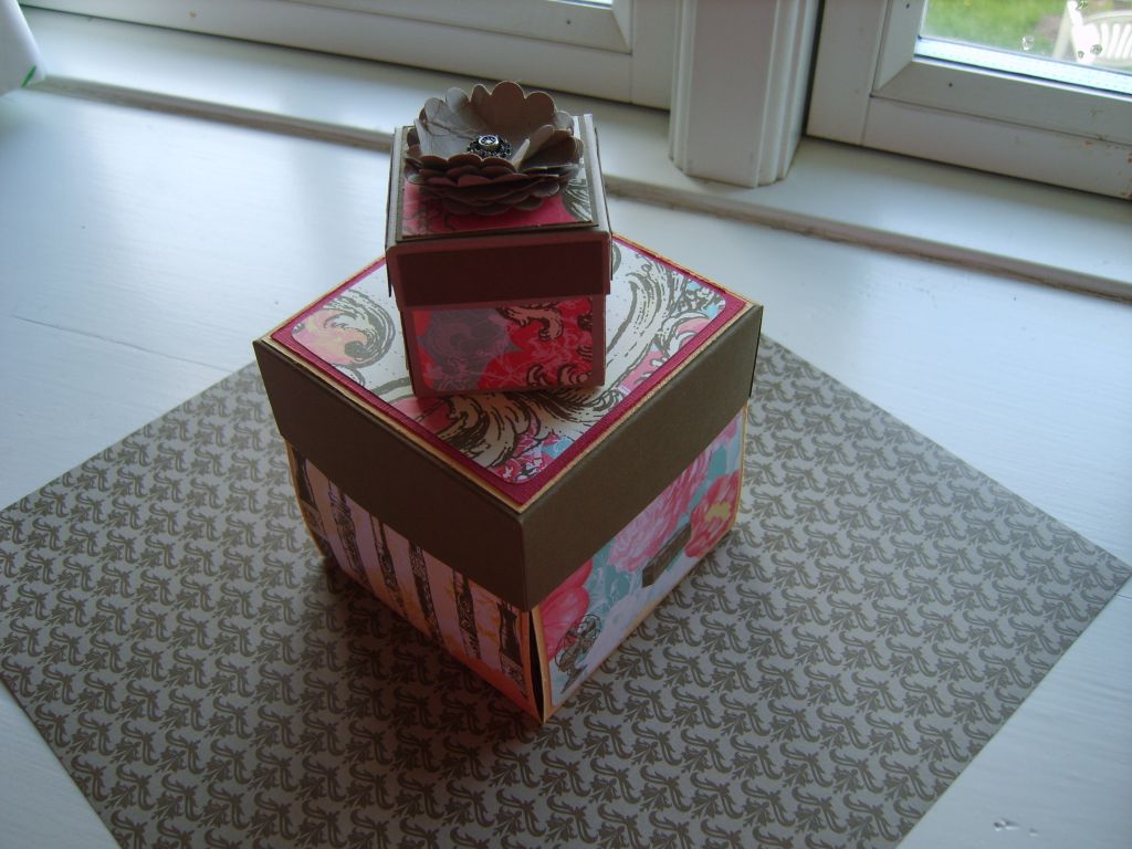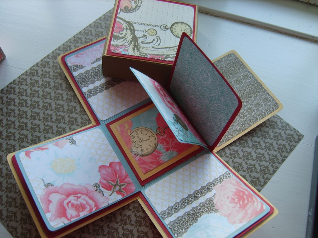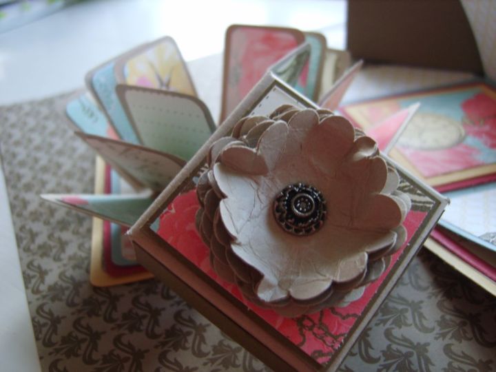 I am sooo excited! In tomorrow mornings workshop we will be creating an Explosion Box . Lots of scrapbooking techniques will be used. We will be „journaling“ and using this small format so that I can explain lots of different ideas without the pressure of having to cover a 12×12 inch page with one idea. ( It can be quite daunting such a BIG BLANK piece of paper.) So here we have 12 little squares to fill, the center of the box and to decorate the lid. Everyone got to chose in advance their own favorite color palette for the box itself and then the fun begins. I have offered my guests the rare opportunity to get their hands into my boxes overflowing with SCRAPS! We will also be „journaling“, and learning to love (or at least to accept ) our own handwriting. This is sometimes quite difficult due to its very personal nature. Telling the story in your own words and in your own hand is for me one of the most important aspects of Scrapbooking. I suppose I am just a purist! ; ) So enough „Crafting Psychology“ -Let’s have some fun! I stayed up until 3 in the morning preparing my Workshop projects and all of my Convention Swaps. So my brain was much too tired to function in German this morning. So pleeeease excuse me! Wenn ihr eine Übersetzung auf Deutsch braucht, schreibt mir einfach eine Email oder einen Kommentar. Anleitung folgt!