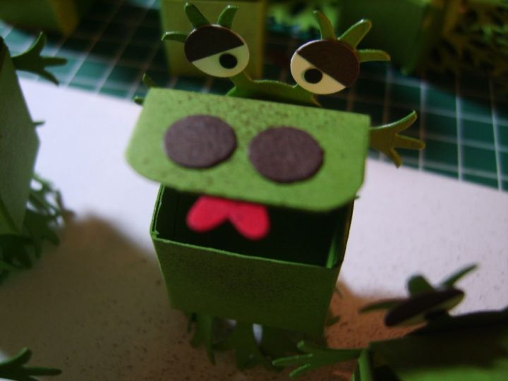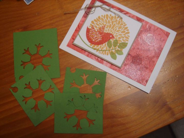 Here is a card that I wanted to show during my „Workshop WOW“ at the convention this weekend and just did not have time to get to do it. I used the scraps I had leftover from making my swaps for the last german Demo-Meeting in Cologne. I made lots of little green „Sigfried the Singing Stamp Monsters“. So I had tons of die cuts from the Bigshot Snowflake.