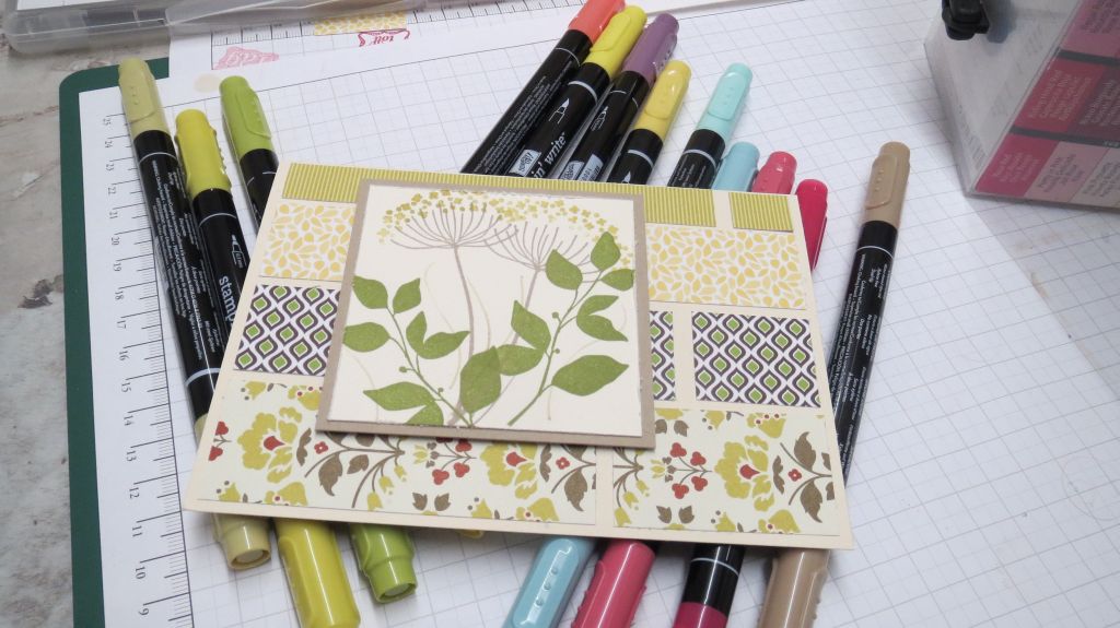 Hier habe ich, (ohne großartig zu überlegen) meine Designpapier-Reste verwertet! Zu diese Karte wurde ich von Demo Doris Kroh inspiriert, meine „Scaps“ in diese hübsche Karte zu arrangieren. Was mir am meisten Spaß gemacht hat, war Papiere zu benützen, die eigentlich nicht zusammen passen, und meinen Sinn für „passende“ Designs und Farbkombinationen zu überlisten! Ich habe alles wieder zusammengefügt, in dem ich mit meinen Schnipseln eine gewisse Symmetrie eingeführt habe.