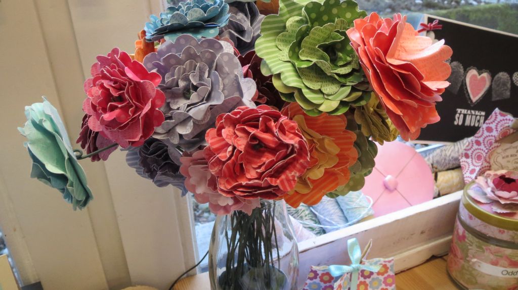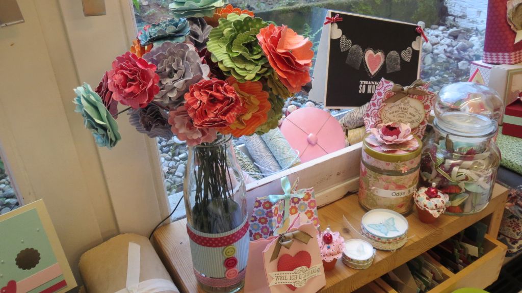 Only a few days left for the 2012-13 Catalogue and for the Spring-Summer Mini Catalogue. So many beautiful stamp sets, design paper, embellishments and tools will be retiring on July 1st. I seem to be rushing to use everything before all of the gorgeous „NEW“ stash is available. I managed to part with some of my scraps by giving them to one of my new team ladies to play with until she has more stash of her own. Then I found another box of scraps and decided that I needed to turn them into something decorative for my windowsill. I am not quite finished but I love the way they brighten up my craft room!