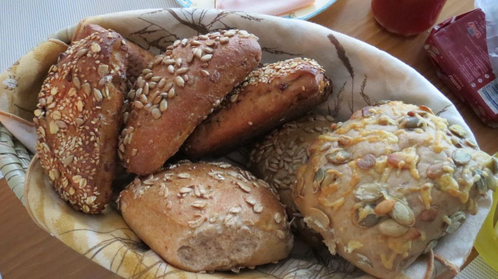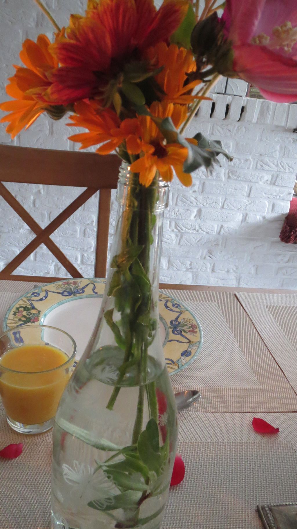 Mokka mit Herzchen auf geschäumter Milch, frische Brötchen vom Bäcker, Hochzeitstag- Karte, Blumen in unseren Lieblingsfarben aus dem Garten und Rosenblätter auf dem Tisch gestreut. Die Rosenblätter sahen verdächtig wie die Rosen im Nachbars-Garten aus?? (Unsere Rosen sind seit 3 Wochen verblüht! :-D!) Romantisch, oder??