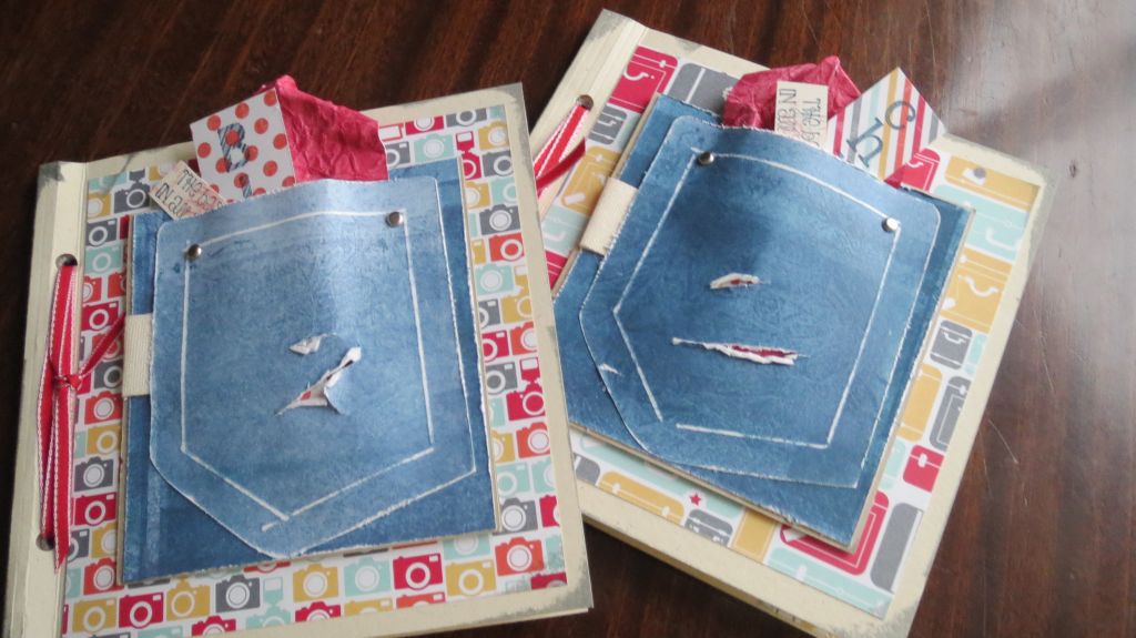 The pages are made of 6 plastic envelopes for Compact Discs. I turned then on there sides and used the envelope flap to punch holes in and attach them to my scrapbook cover. They are bound together with a real red ribbon! I stamped a few pages and added DSP to get them started and filled the back page with matching papers and cardstock making embellishments or just framing their travel pictures!