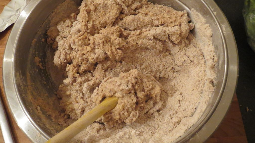 1/3 Tasse Kalte ungesalzene Butter in kleine Flocken rein mischen (mit den Fingern, am besten)
