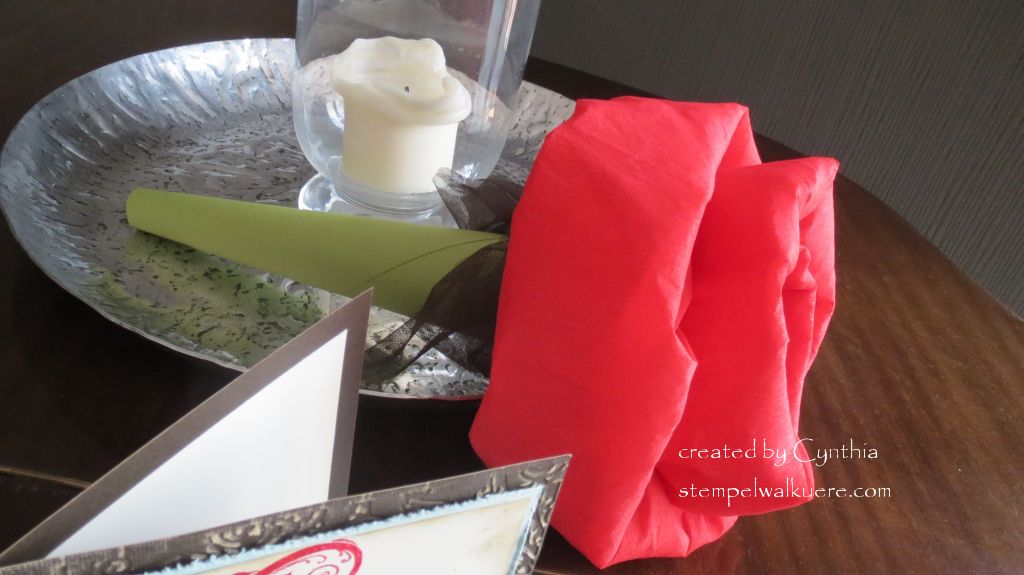A beautiful Flamenco Fan had to fit inside the rose. So I used a rolled piece of Stampin‘ Up 12×12 textured cardstock in Old Olive The ribbon is a great buy in my online shop Early Espresso scalloped tulle. Fantastic to work with!