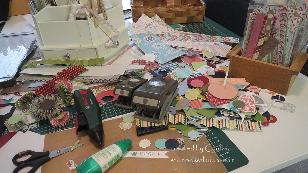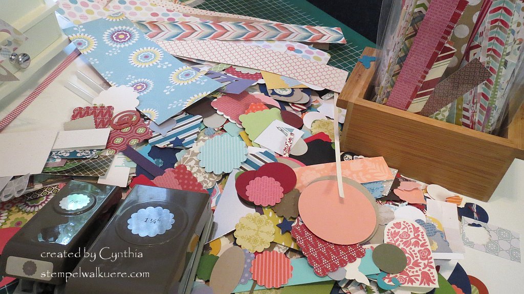 Today is my official personal „Organize my paper-scraps-day!“ I stayed up late to gather design paper treasures out of all of their hiding places in my house, organize the ones I will use and part with the rest! (Ha-Ha ! What a joke!)