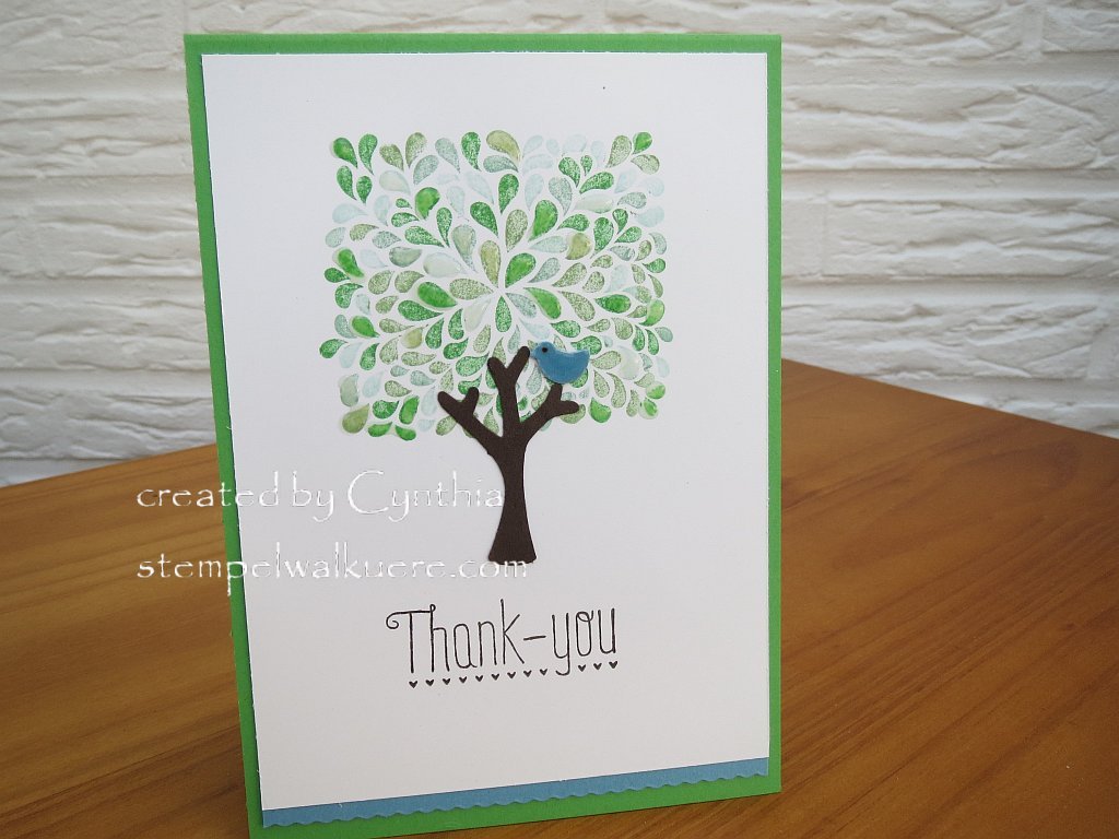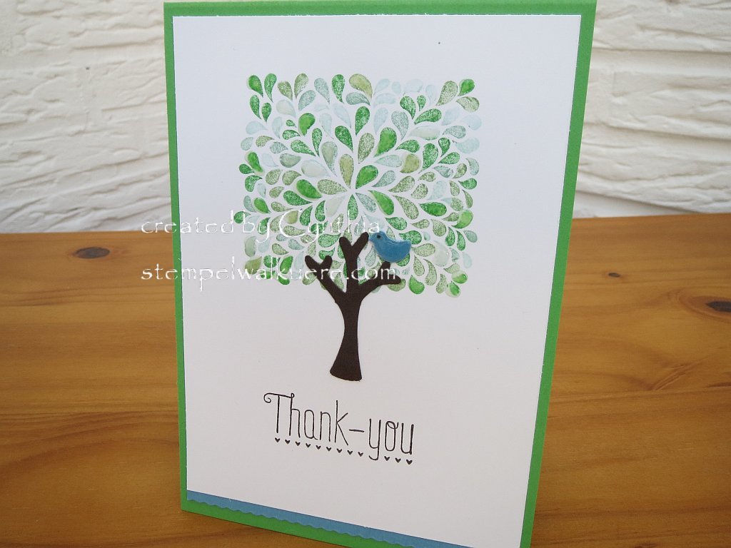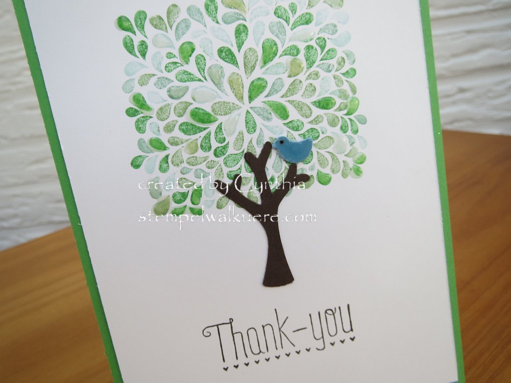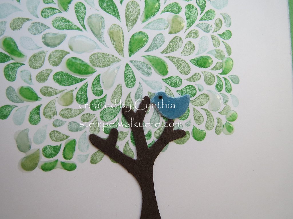 For this card I just took out my Stampin‘ Write Markers and colored directly onto my rubber stamp. For a little texture I used Glossy Accents on a few leaves and the little bird.
