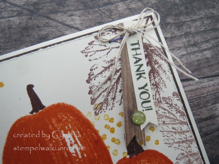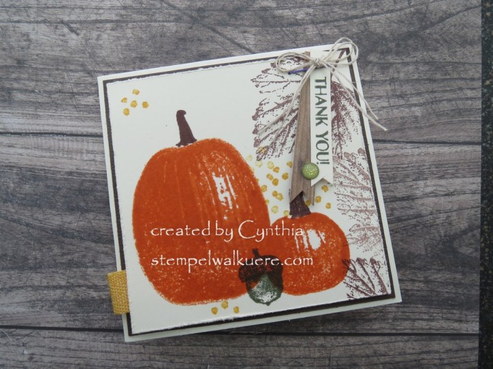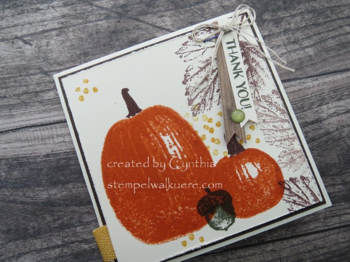 Als Stampin‘ Up Demo habe ich die Möglichkeit, die tollen Stempel-Sets als erstes zu ergattern! Ich habe hier im Bastelzimmer allein 10 wunderbare Stempelsets für Herbst und Winter vor mir liegen. Seit Wochen rufen Sie laut zu mir „Komm – bastel mit mir!“ Heute habe ich es geschafft diese hübsche Kürbisse auszutesten. Weil Orange nicht richtig meine Lieblingsfarbe ist, war meine Stempelkissen doch noch sehr voll mit Farbe und hat auf meinen jungfräulichen Stempeln kleine Blasen von überschüssiger Tinte gebildet. Dies hätte ich natürlich besser mit einem Küchentuch abtupfen müssen, aber ich war irgendwie zu faul in die Küche zu gehen, um welche zu holen. 😀 Ich war gerade im „Kreativen Fluss“ und wollen auf gar keinen Fall auf dem Weg zur Küche am meiner Waschküche vorbei, denn dort hätte ich auch meine Wäsche lauthals rufen hören können! 😀