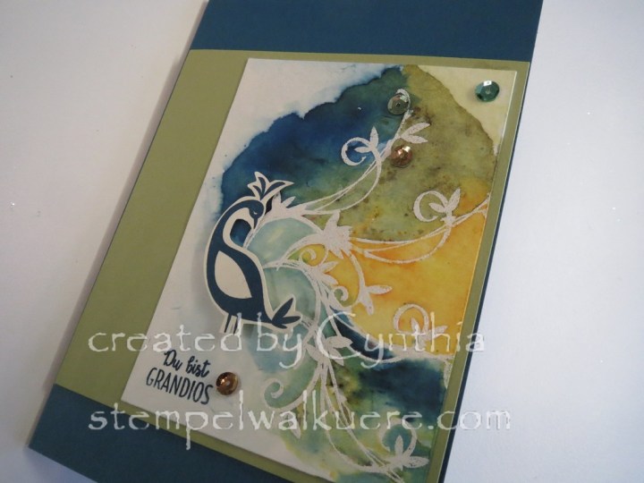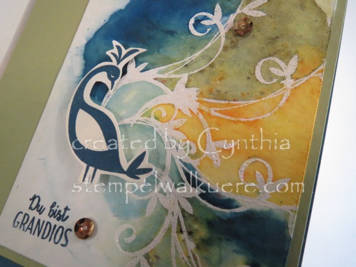 First, I stamped my background with Versamark ink and then heat-embossed with white embossing powder. This is a great technique for creating fun background designs. After this, I applied water with a water tank brush and sprinkled Brusho VERY sparingly on each area, letting it dry first before moving onto the next color. The most difficult part of this technique is the „waiting“ for it to dry. I am not very patient when I am in the flow 😀 ! For people like me, I suggest you use your heat gun. But be aware that using your heat gun will change your resulting design. I did one card practicing PATIENCE and one IMPATIENCE card, the results are both very good BUT, to be honest, the „patient“ card had more deepth of color, dimension and more interesting designs.