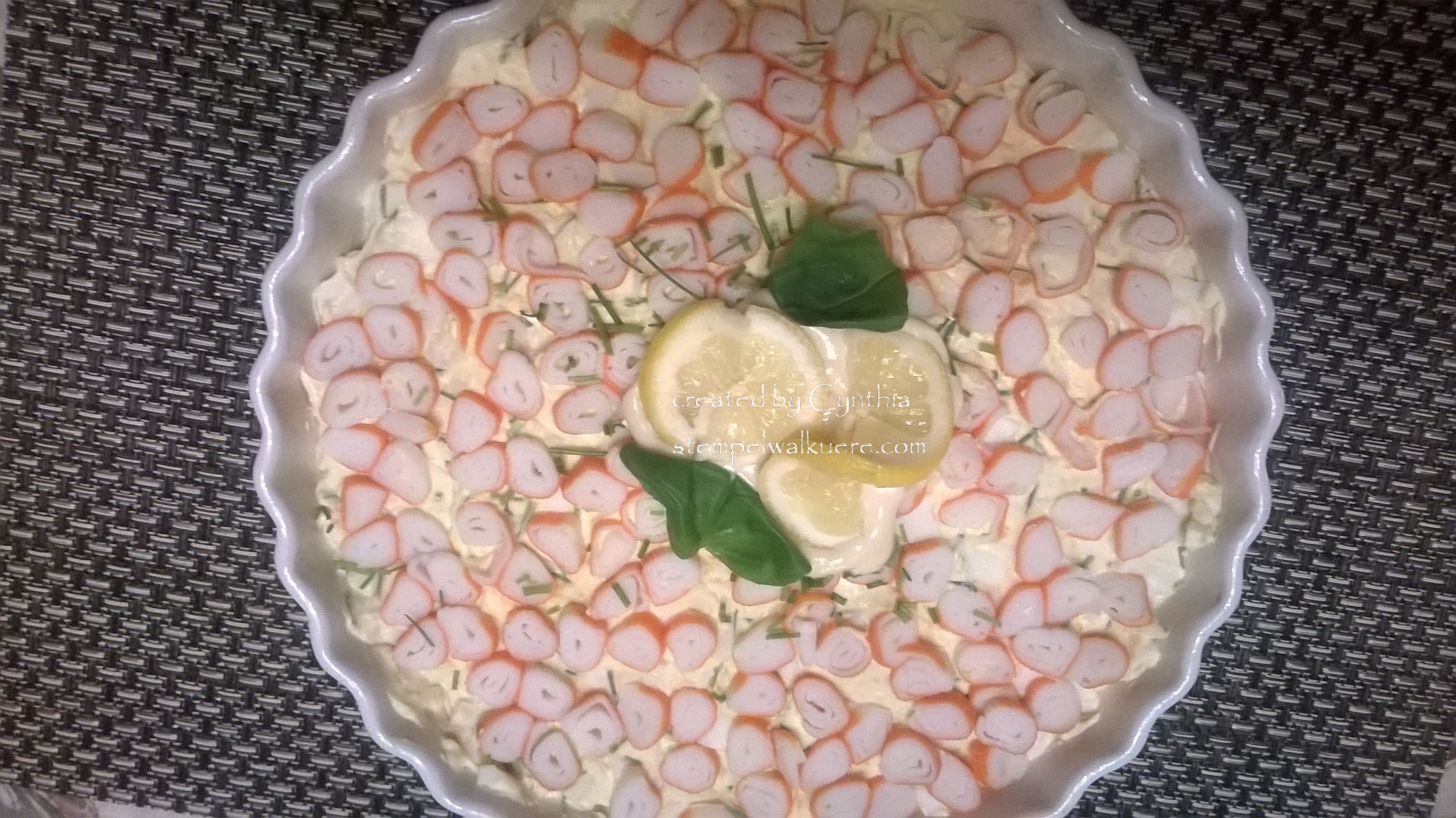 My Egg-Surimi Dip is made of chopped hard-boiled eggs, chives and creme fraiche topped with sliced Surimi. Serves 10.